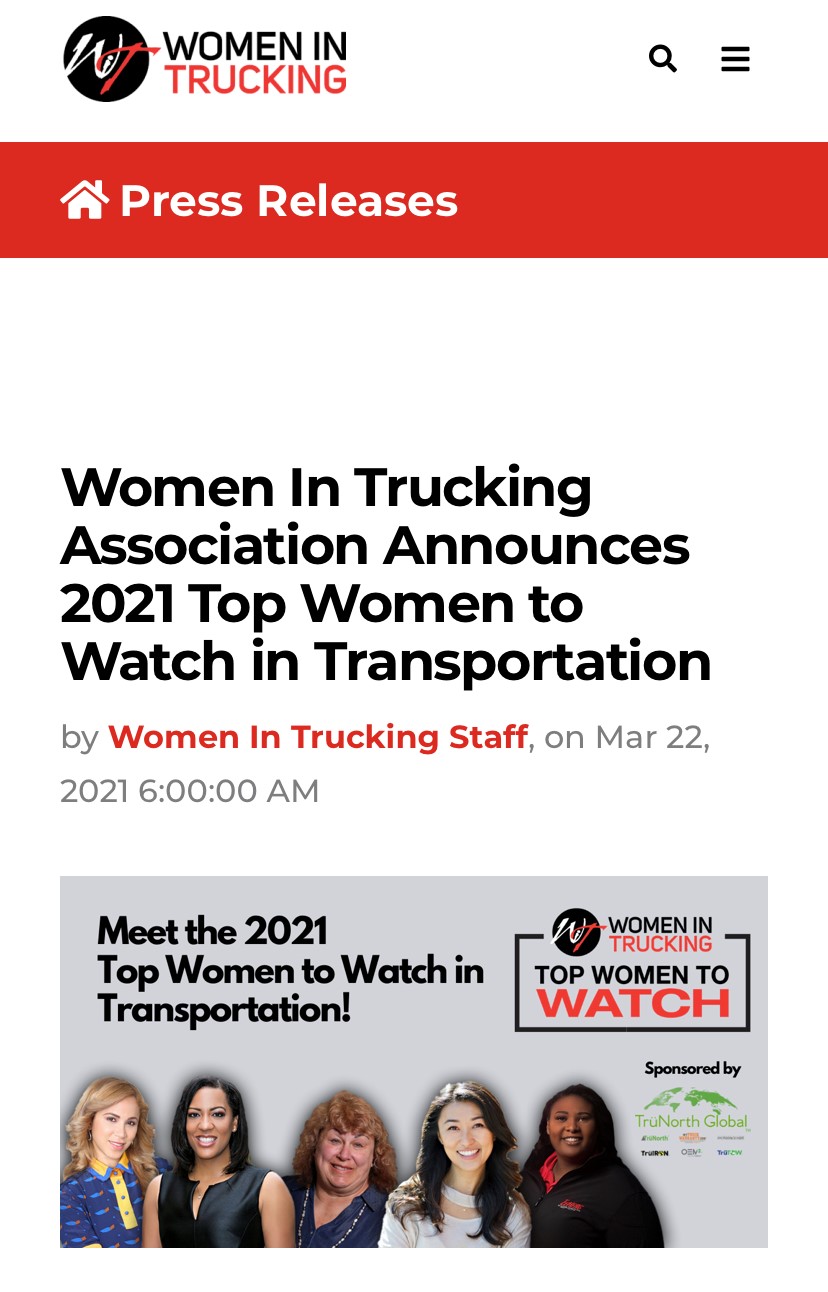 We’d like to thank the Women In Trucking Association for recognizing Aria Logistics’ s CEO Arelis Gutierrez as one of the top women to watch in transportation for 2021. To read more click here to read the whole article.