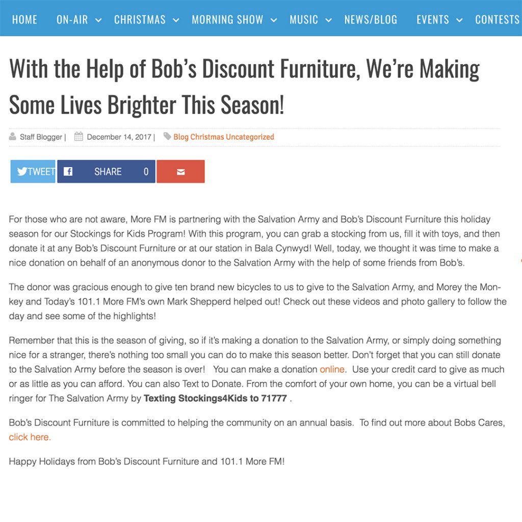 It was a pleasure assisting Bobs Discount Furniture & XPO Logistics with their anonymous donation of ten children’s bicycles to the salvation army. Click here to read the full article. Remember it’s the season of giving!