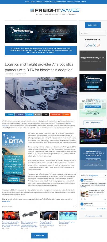 Aria Logistics is very proud to announce that we have partnered with BiTA. Want to learn more? Check us out on Freight Waves by clicking on the Article below!